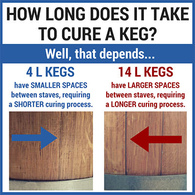 How long does it take? Depending on the dryness level of the wood this process can take anywhere from a few minutes to more than 24 hours. Smaller kegs, such as the 2 or 4L size, have smaller staves and therefore take less time to cure than larger kegs. This is because smaller staves require less water to expand than do larger staves. If you're curing a larger keg, hang in there--this is a proven technique that will efficiently tighten virtually any keg, so it will be worth your troubles!